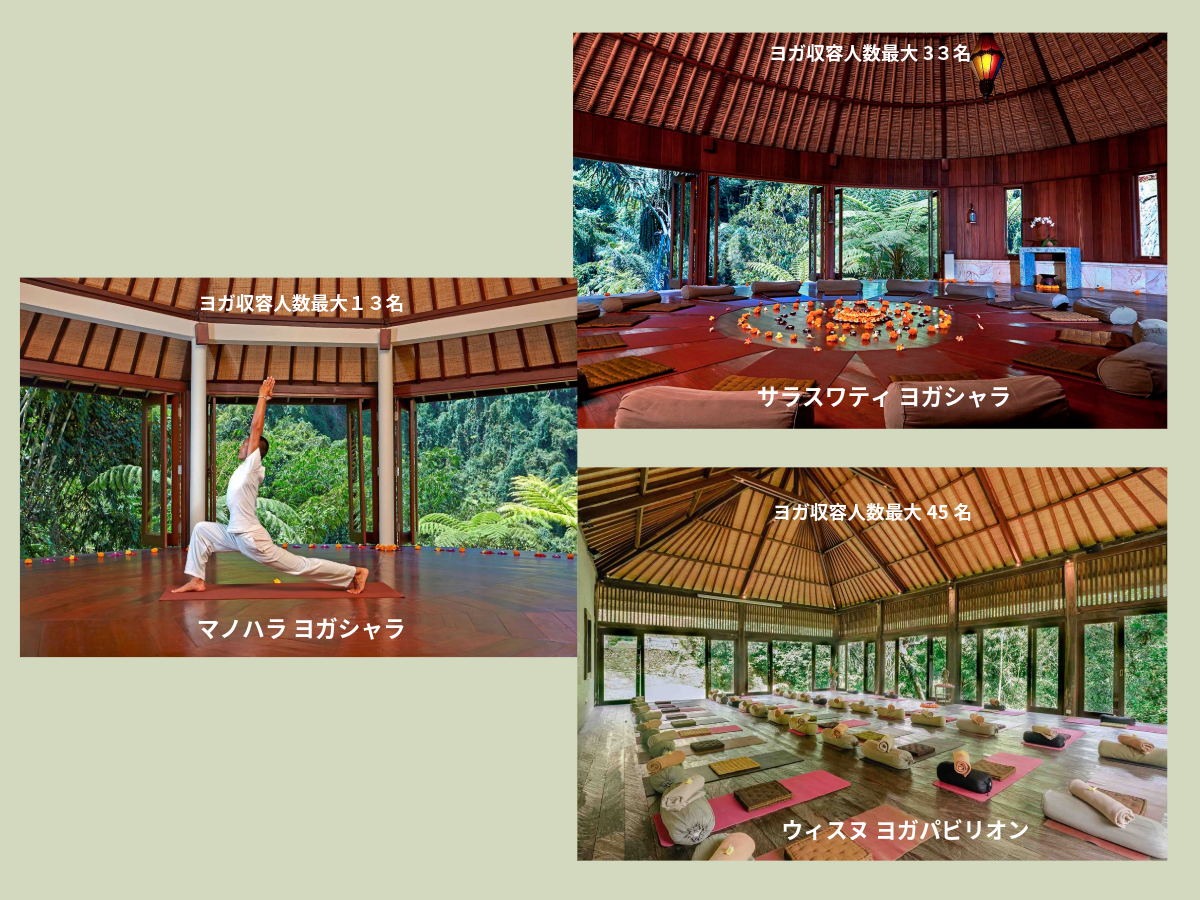 世界中のヨギーニに愛される、バグース・ジャティの3つのヨガルーム。自然との調和を大切にした3つのヨガルームがあり、世界中のヨギーニたちに親しまれています。ヨガルームは、瞑想やワークショップ、セミナーやミーティングにも利用できます。
