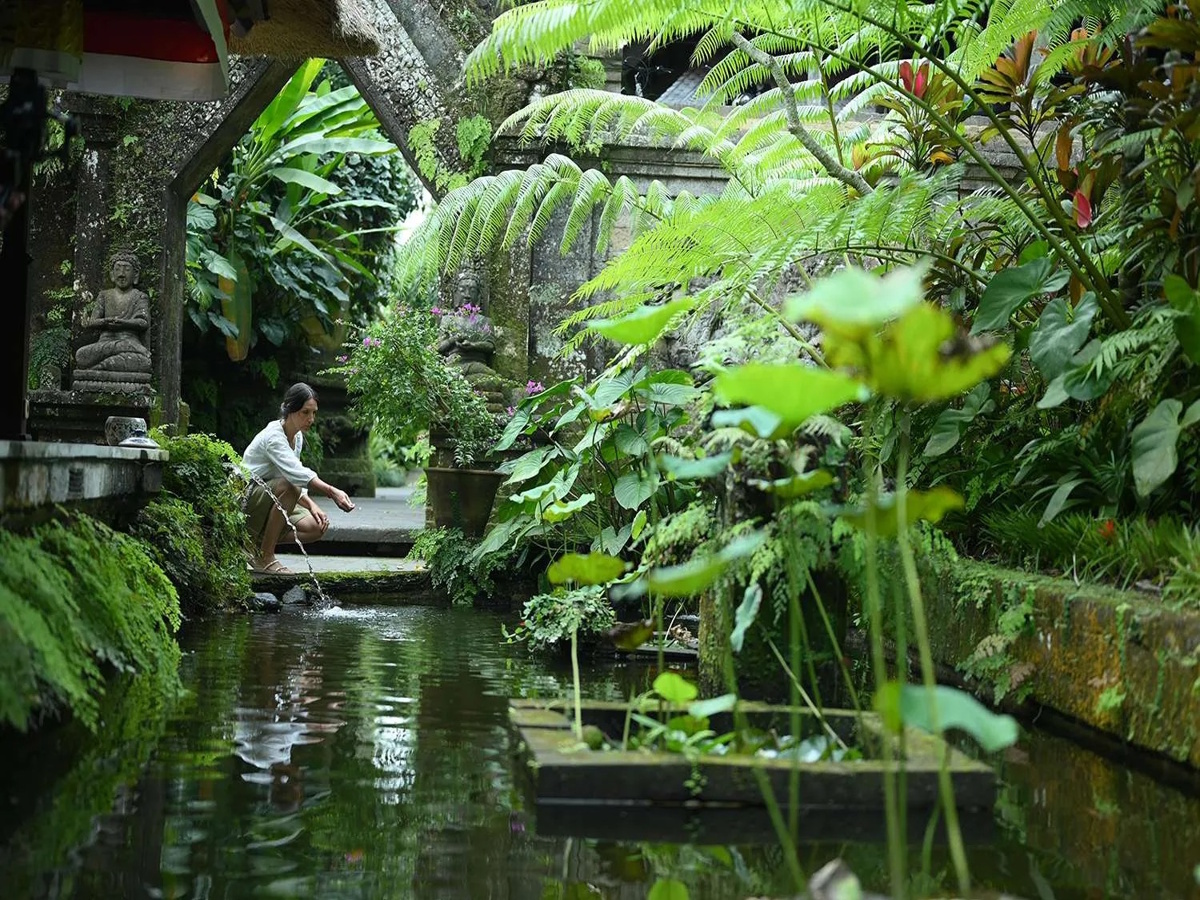 ウブド中心部からほど近く、緑豊かなジャングルに包まれた静寂の中に佇む「イバウブド」苔むした石壁や繊細な彫刻が点在する敷地は、まるで屋外美術館のような趣を醸し出し、訪れる人々を非日常へと誘います。