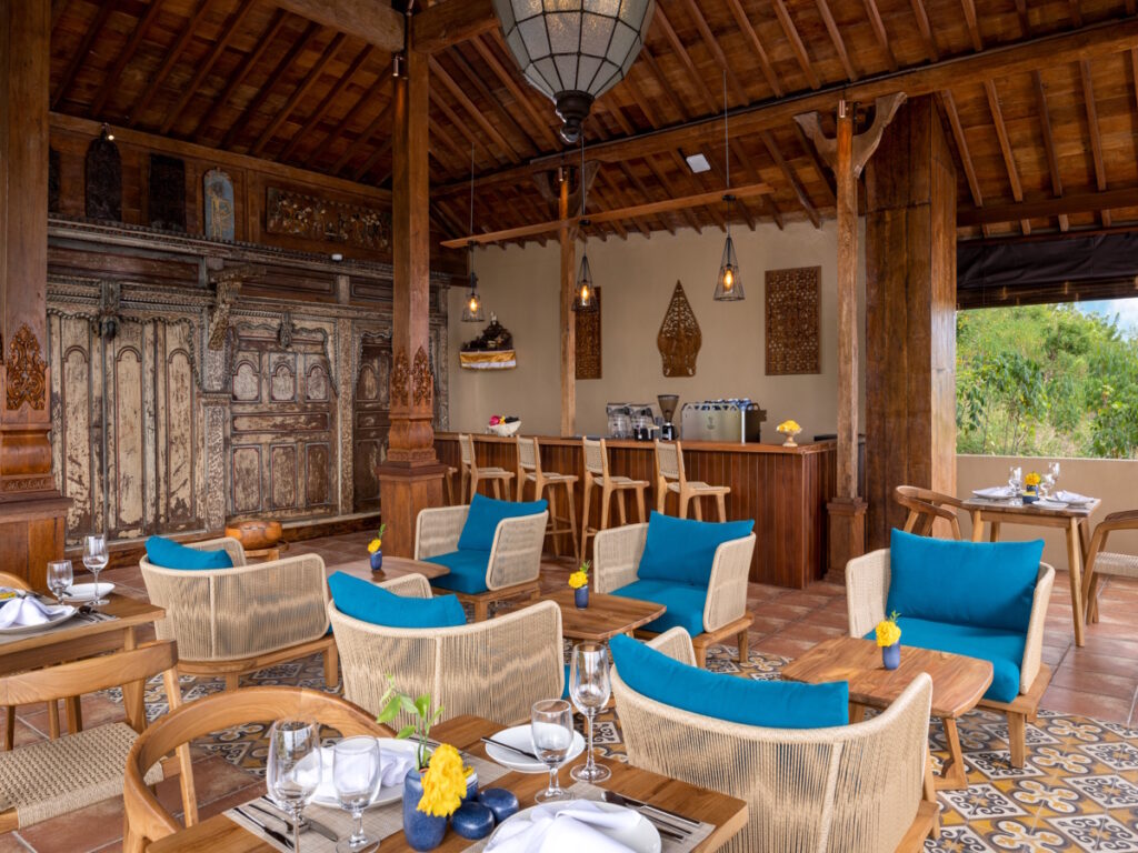 ジャワ島の伝統的な木造建築を移築して造られた、趣と開放感を兼ね備えたダイニング空間です。インドネシア料理や創作フュージョン料理を楽しめます。