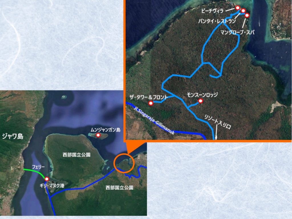 デンパサール空港からは約4時間。ジャワ島とのフェリーが行きかうギリ・マヌク港に近い立地です。南部の観光地から遠く離れたこの地はバリ島の中でも最も静かで、最も自然が濃いエリアです。382ヘクタールもの西部国立公園の敷地内にあり、森・マングローブ・海がひとつにつながる壮大な自然の中に佇んでいます。