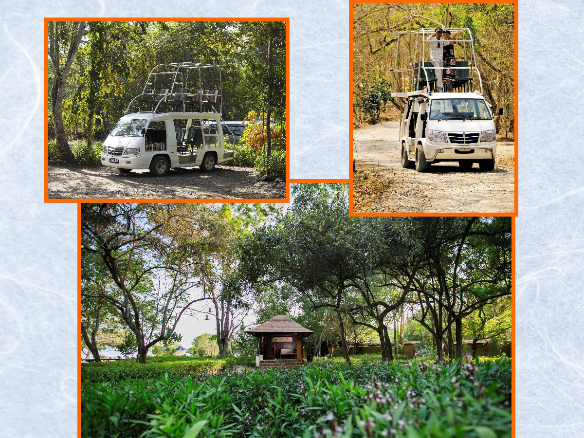 リゾート内の移動は、2階建てのサファリバス。客室からビーチレストラン、タワー型レストランまでを結ぶこのバスに乗ると、移動そのものが小さなサファリ体験になります。高い視点から眺める森の景色は開放感があり、道の途中で野生の鹿や鳥たちに出会うこともしばしば。ビーチにあるレストランの停留所は写真のとおり、森の中にひっそりと佇んでいます。木々の香りや鳥の声に包まれながらバスを待つ時間さえ、この場所ならではの体験になります。