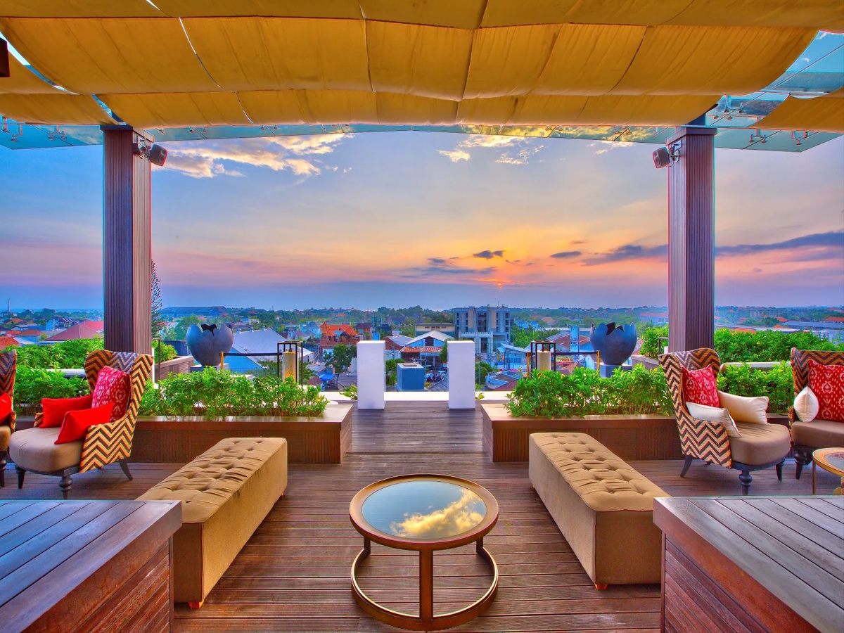 スミニャックの象徴的な景色を一望できる、スタイリッシュなオープンエアのルーフトップバー。沈みゆく夕日を眺めながら、洗練されたひとときをお過ごしいただけます。